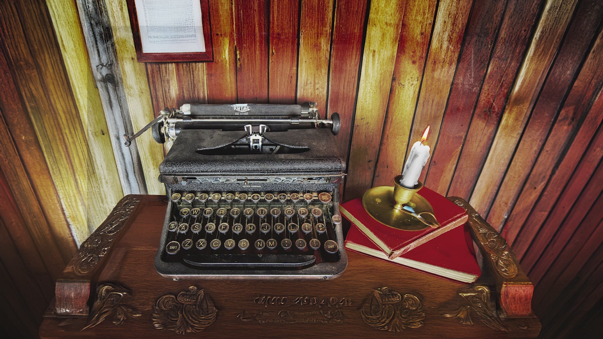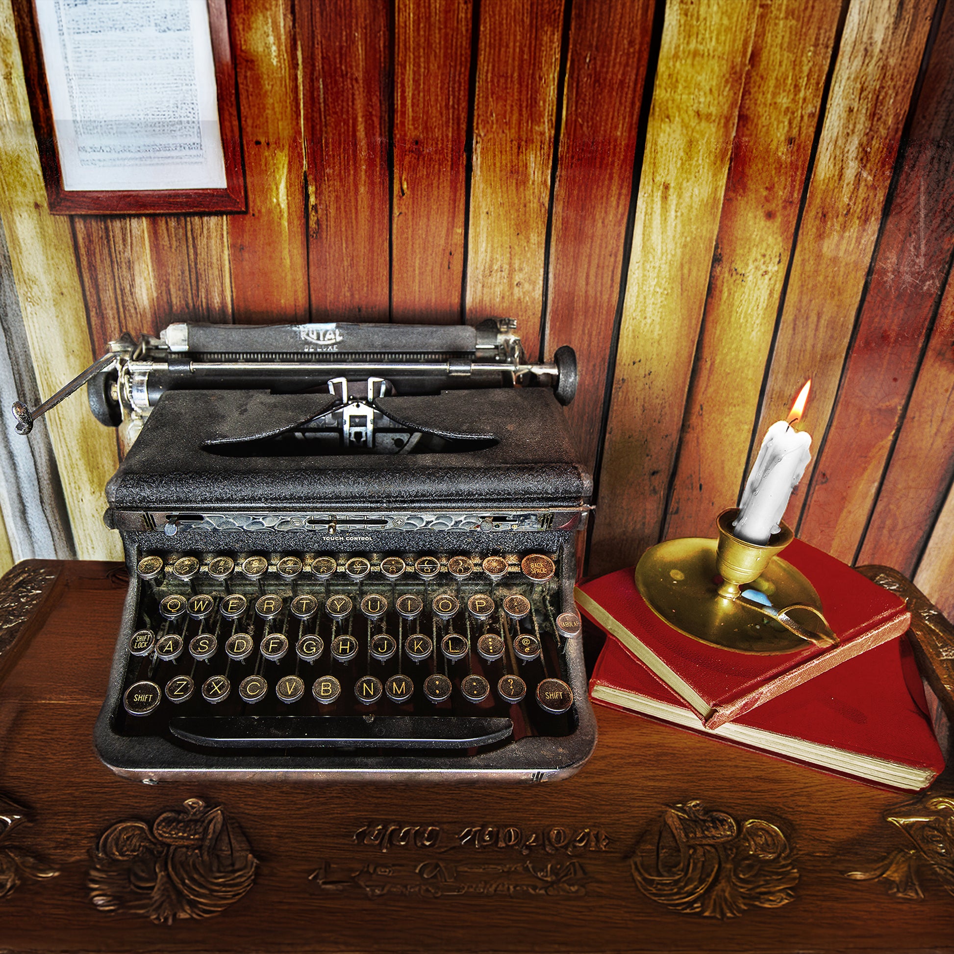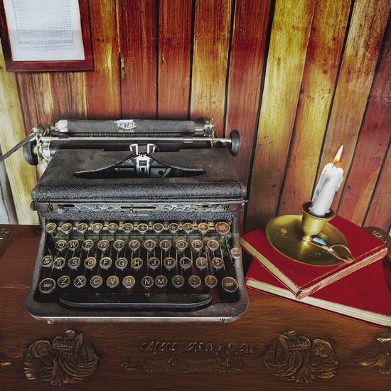 Vintage Royal Typewriter on a Desk with Vintage Books by Candlelight