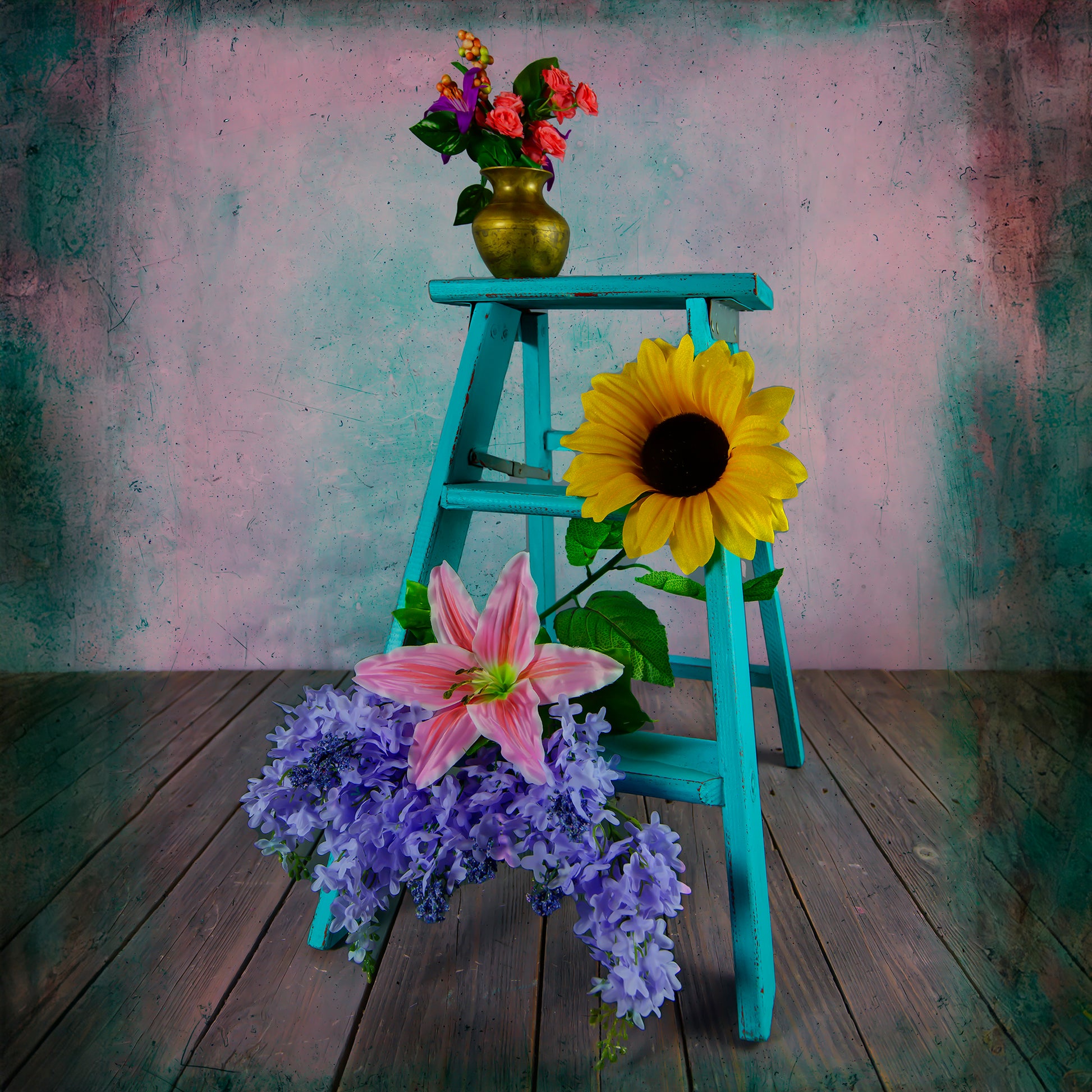 Flowers have an artform of their own, so I decided to focus on their natural colorful beauty. Using this old stepladder, that once was a washed-out red color, I painted it a bright turquoise and weathered the edges. Placing flowers on the rungs really made the art pop and the old brass vase containing the small pink/reddish flowers on the top step provided a nice contrast.