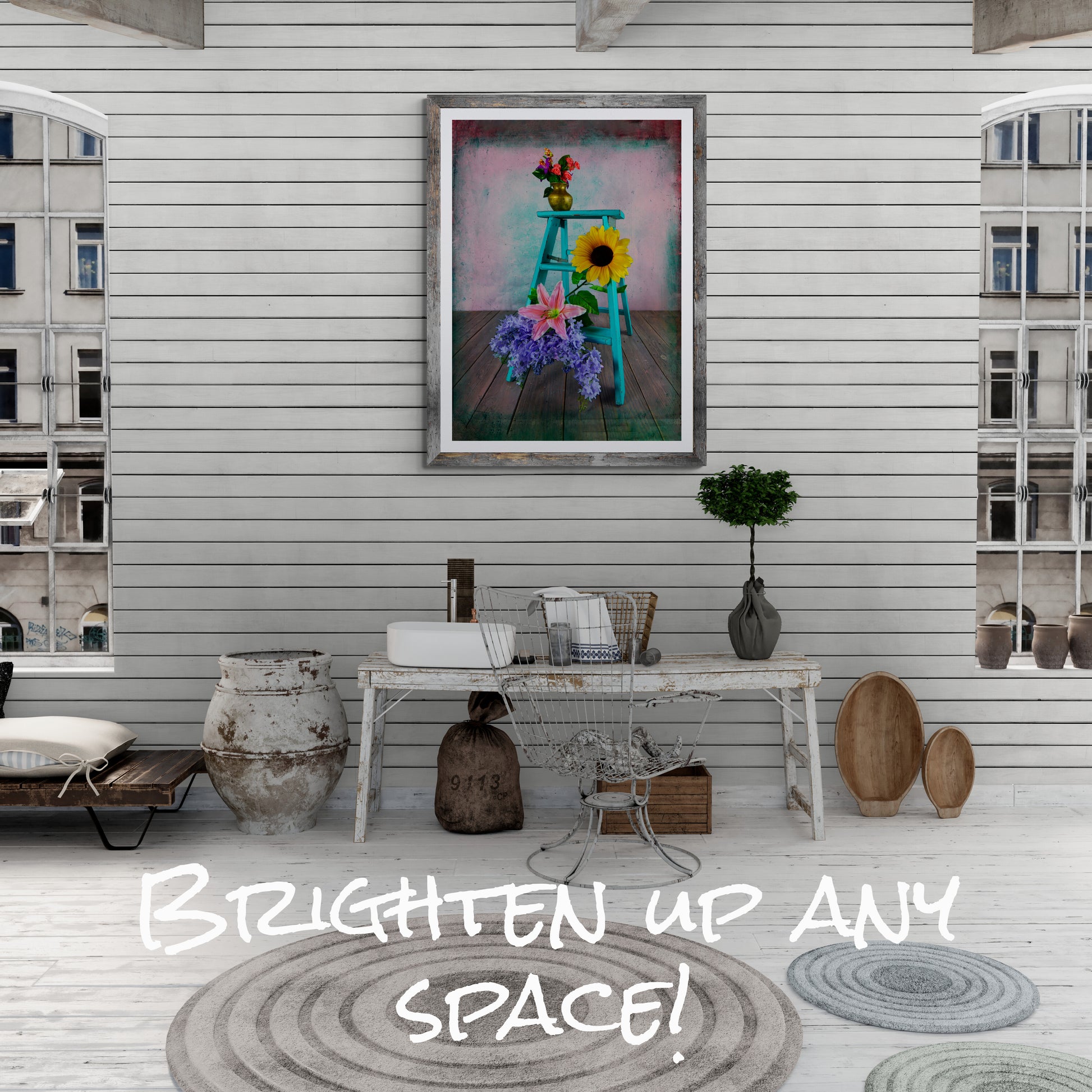 Colorful print with an array of spring flowers on a turquoise step ladder will bring color to any room.