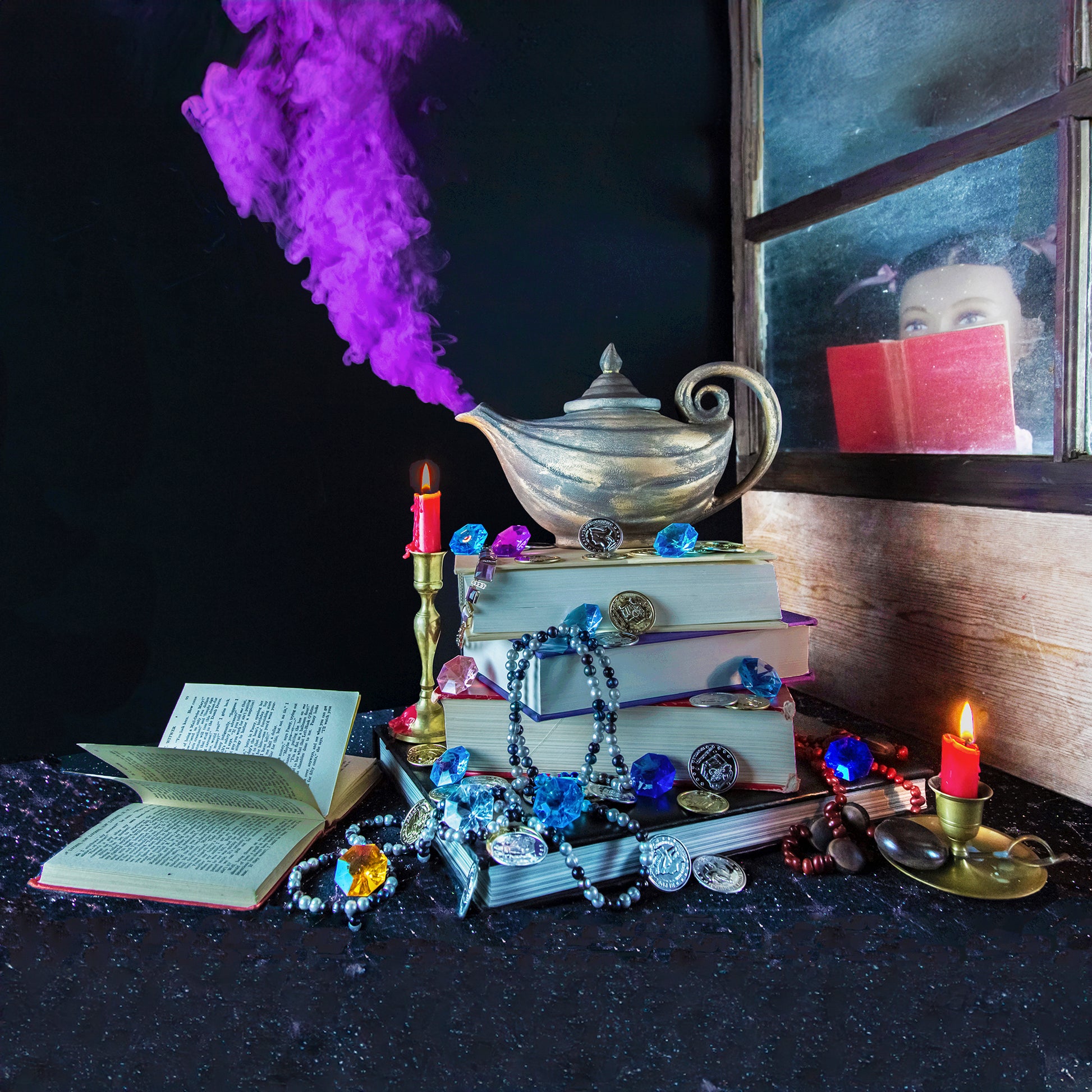 Behold the classic tale of a magical Genie, retold through an incredible art print! With a vintage teapot-turned-lamp, a 4-pane window from a century-old cabin, and a hair stylist's mannequin, my magical Photo Art creation was a blast to make. "Genie's Magic Lamp Smoke."