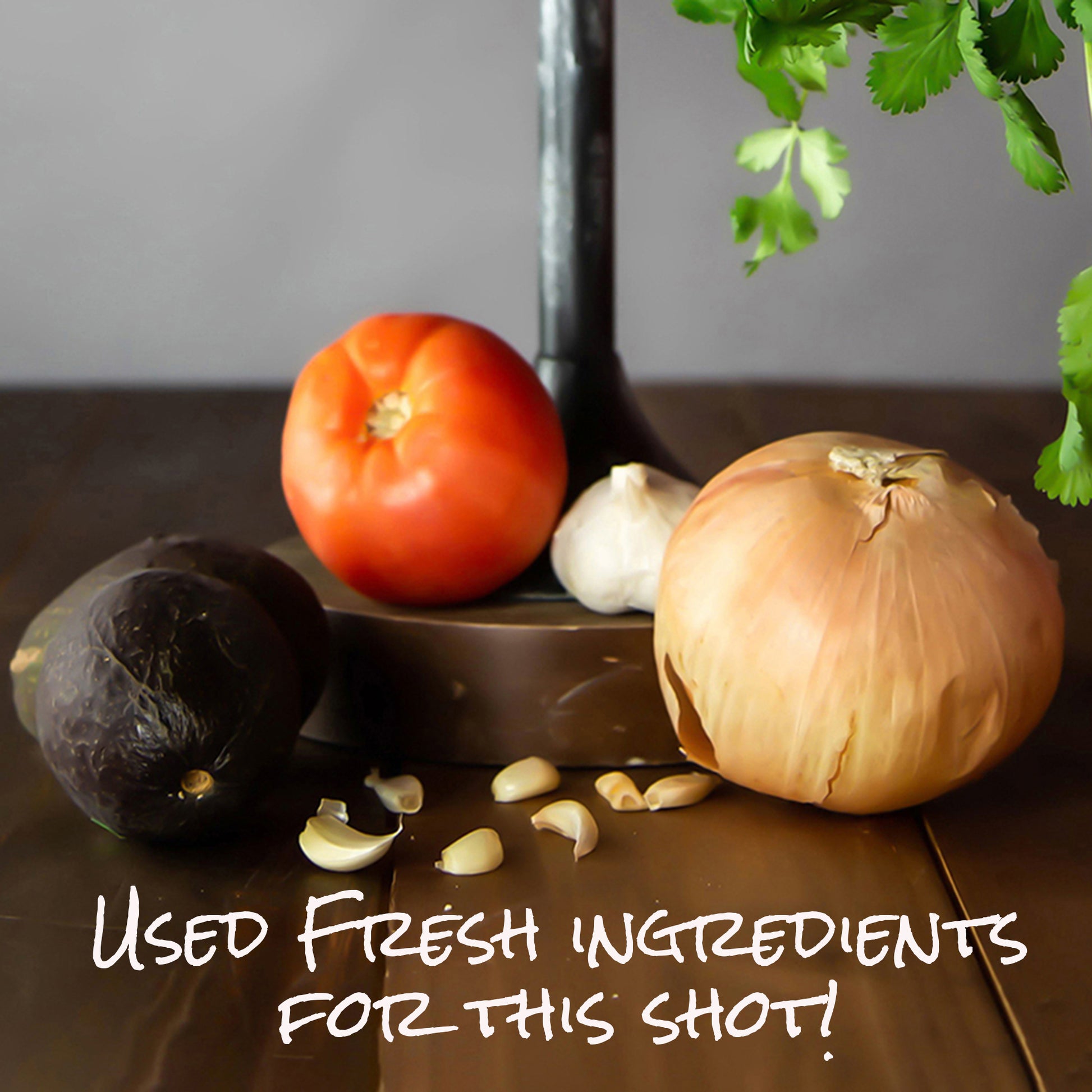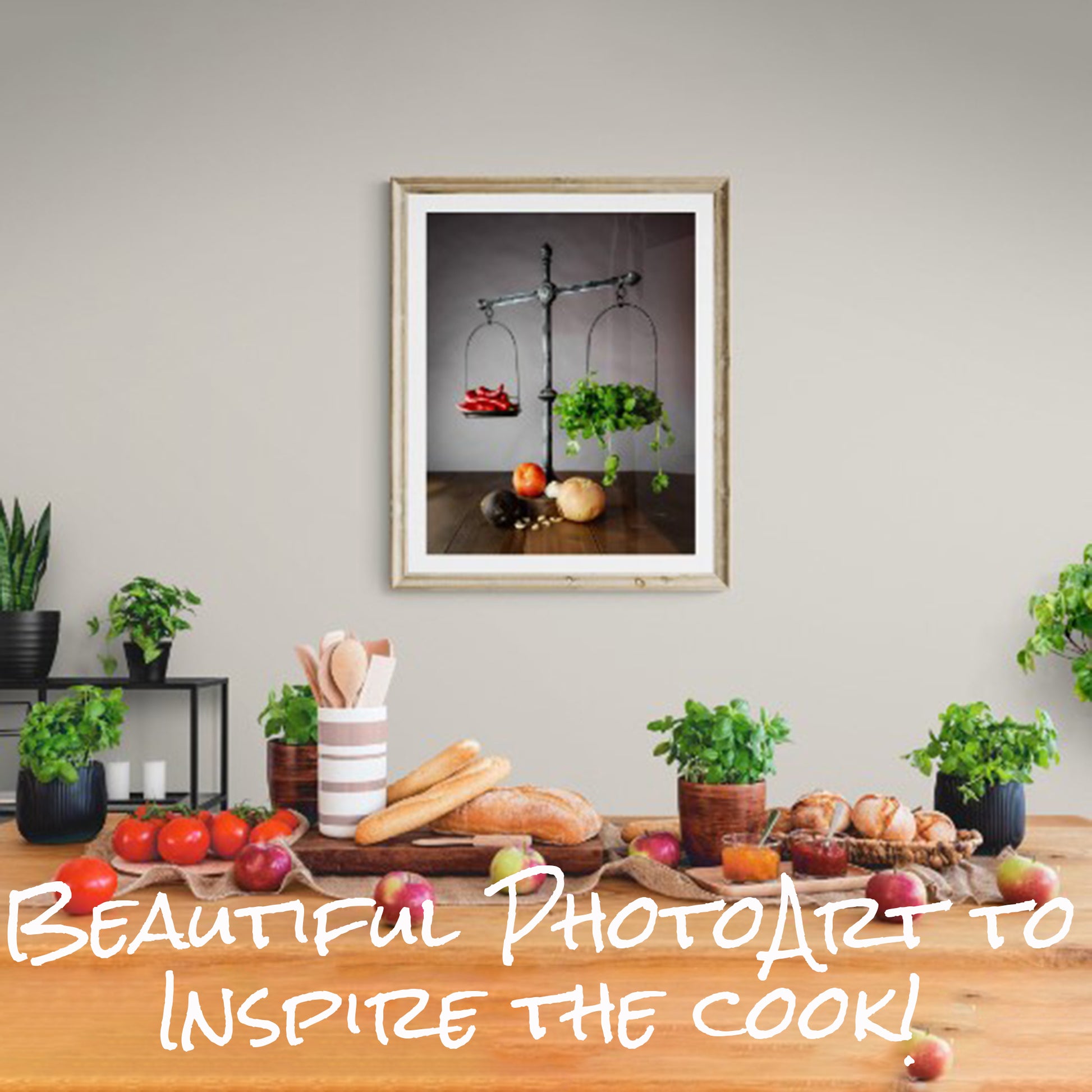 Bring a spicy touch to your home with this Salsa still life featuring a balanced scale! Onions, cilantro, peppers, avocado, tomato, and garlic are all included in this classic recipe. It's the perfect way to show your love of salsa - and it makes a great piece of kitchen décor, too. "Salsa."