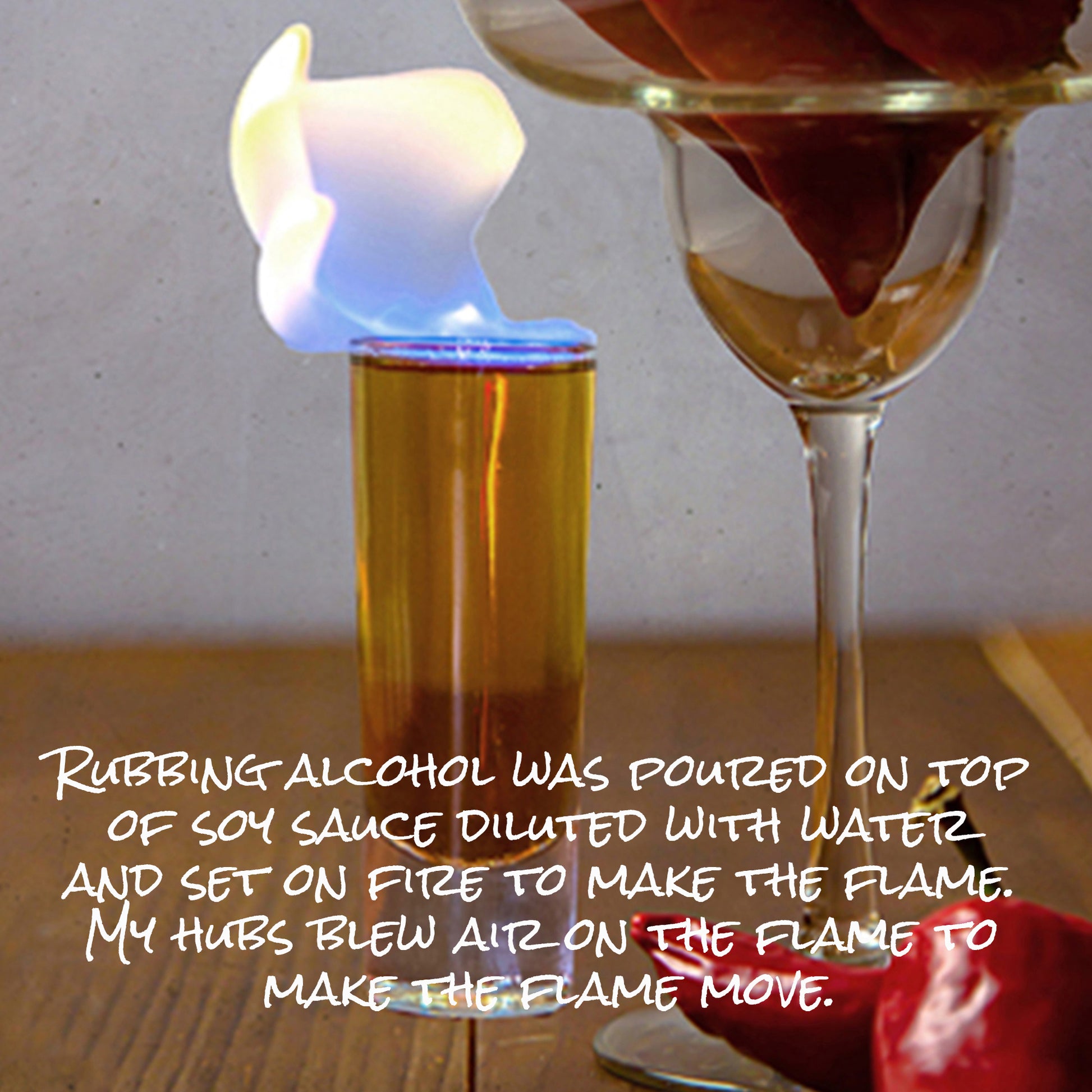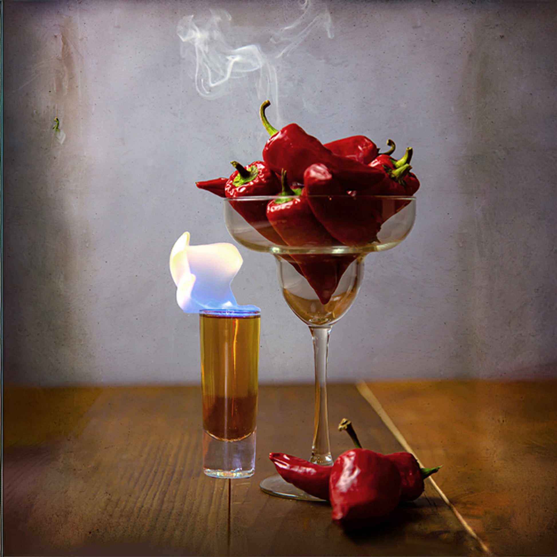 Chili peppers in a margarita glass get all "smokin' HOT", with the alcohol blazin'! Add some spice to your home bar or lounge area with this scorching art. I sage-smudged it so it can chase out all the bad ju-ju, then got my hubby to puff on the flame for an extra kick and motion. Good times, with surprisingly "cool" consequences for the house! "Smoking Hot Chili Peppers."
