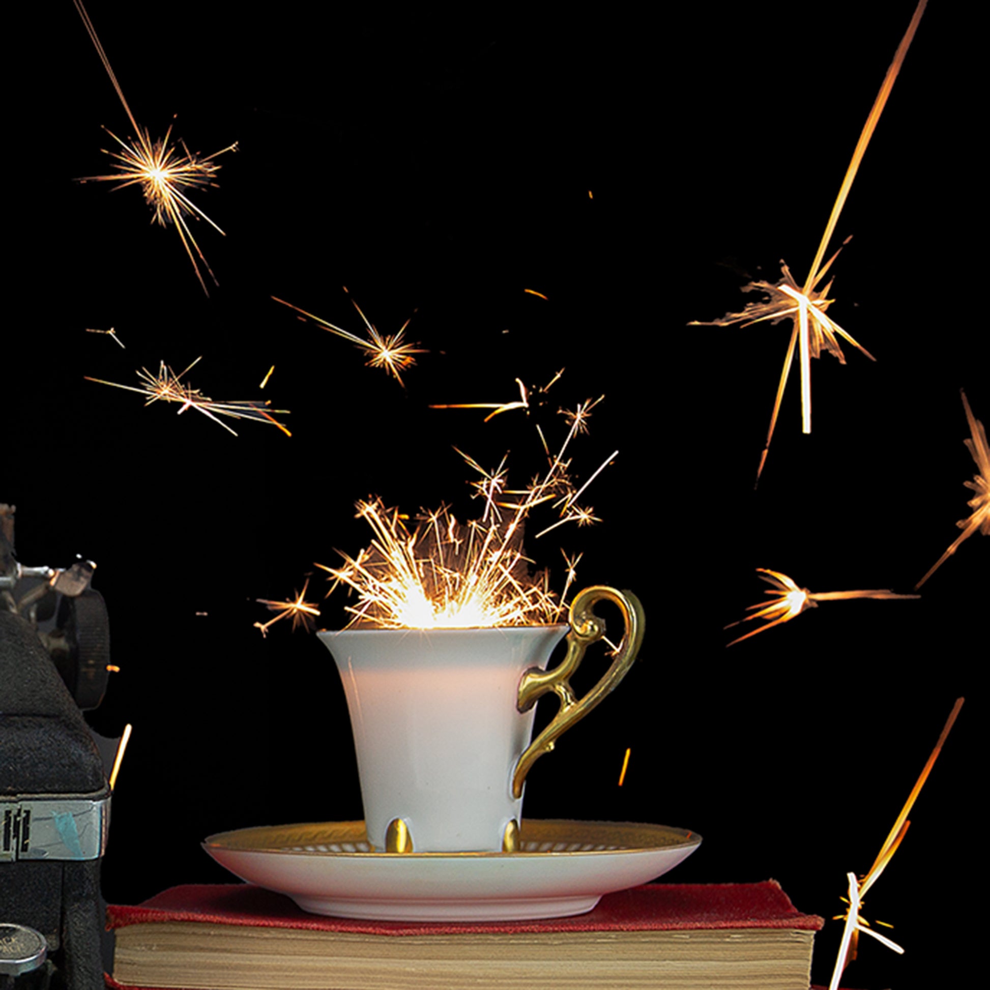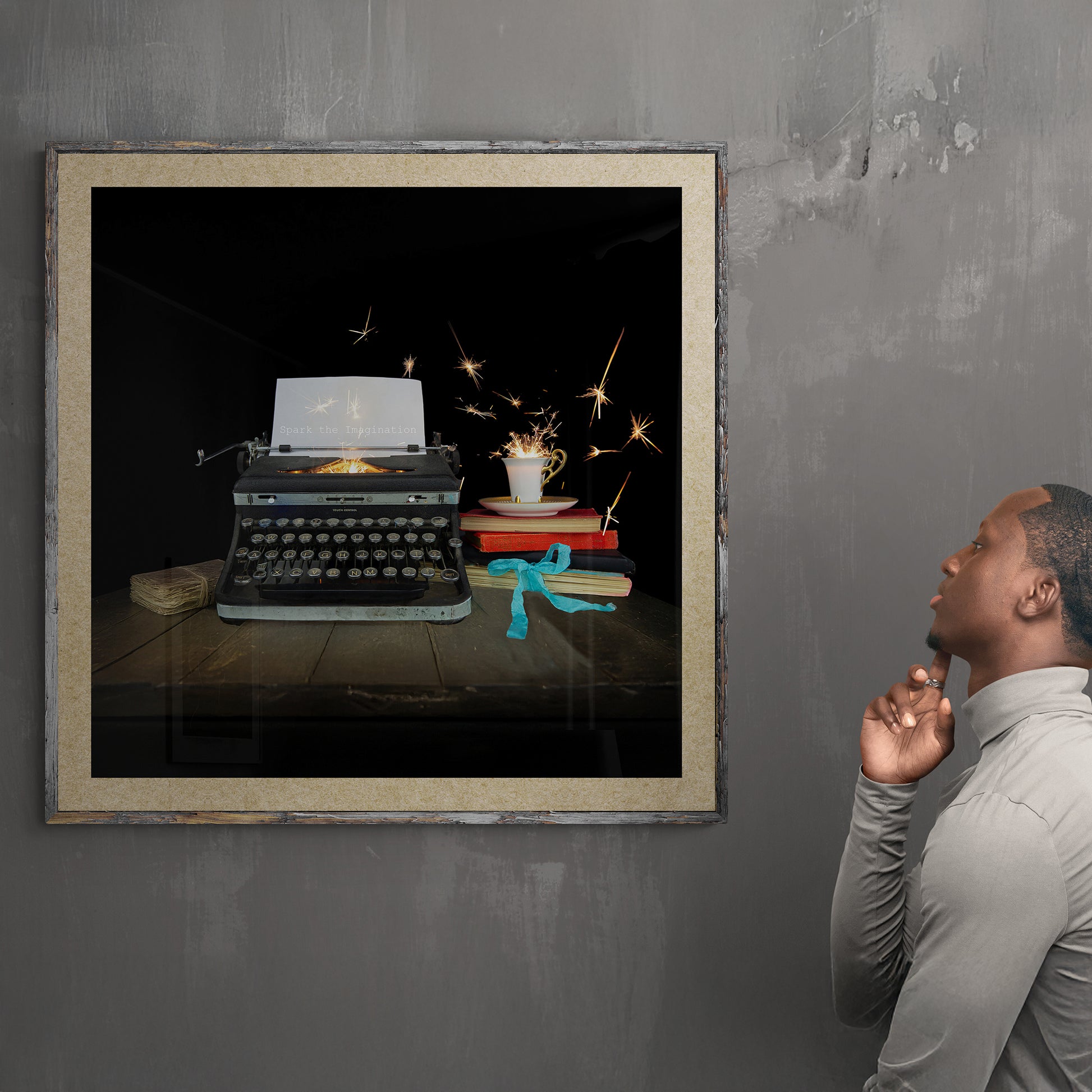 Bring your creative side to life with 'Spark the Imagination'! This upcycled vintage Royal Typewriter turned Photo Art hopes to spark your imagination! The sparks in the teacup symbolize the transfer of inspiration to the paper in the typewriter, igniting your imagination for your next big idea!